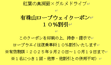 特典 商工会HP上クーポンを印刷の上、持参・提示でロープウエイ往復乗車料10%割引(有効期限:9月20日~10月19日まで・1名につき1回・他券・他割引との併用不可)